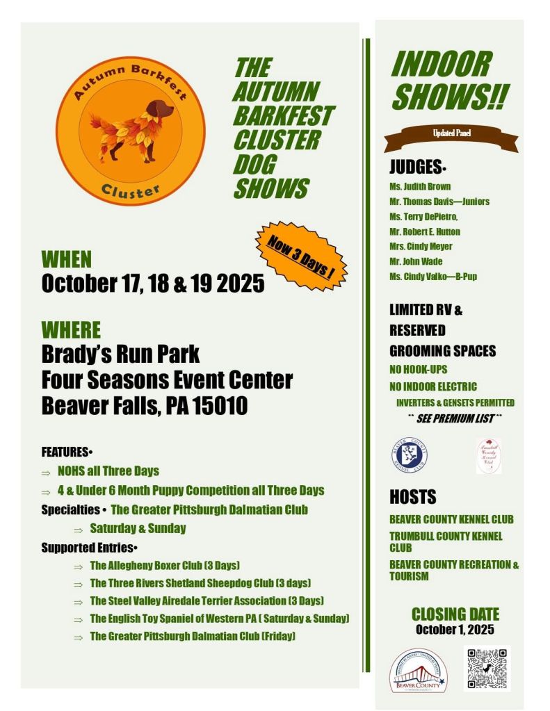 BCKC also takes part in a second AKC all-breed show in its home county during mid-October. The Autumn Barkfest Cluster features three days of all breed, specialties, and supported entries, as well as the National Owner-Handles Series. It will take place in picturesque Brady’s Run Park in Beaver Falls, PA.